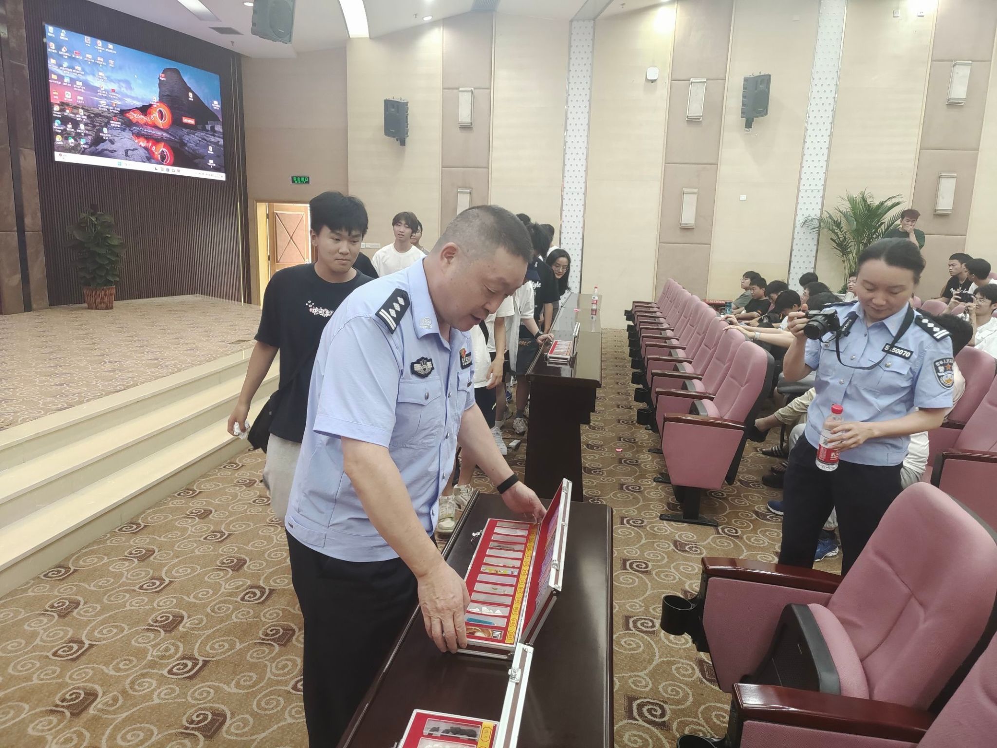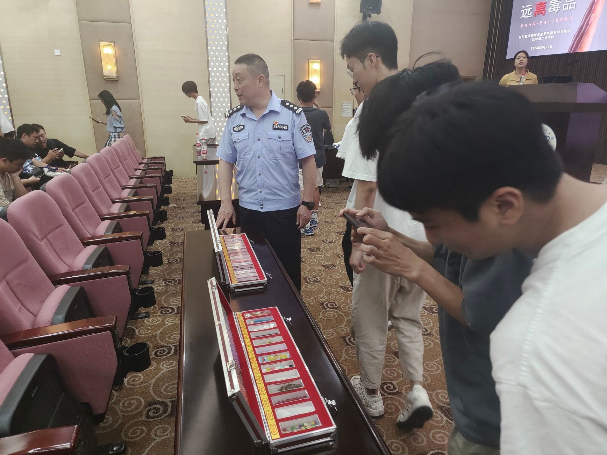四川省成都戒毒康复所教育矫正中心石海涛同志进行教育讲解在活动现场,警官们结合一线工作的丰富经验和真实案例,为师生们细致地介绍了毒品的种类与危害以及中国禁毒史与毒品犯罪相关的法律法规,告诫同学们要提高毒品对人类、社会、国家危害程度的认知,在日常生活中保持高度警惕性,远离毒品、珍爱生命。在仿真毒品展示环节,警官们向同学们展示了传统毒品与新型毒品的种类,尤其是变身为“糖果”、“止咳水”、“开心水”等与日常药品、零食毫无差别的新型毒品,强化了师生们对新型毒品的辨别能力。