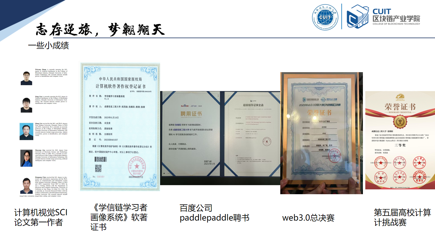 2023-2024学年:1、计算机视觉方向SCI一作,目前在CUHK-PEDES数据集上取得SOTA的结果;2、获得计算机软件著作权登记证书,软件名称为《学信链学习者画像系统》。