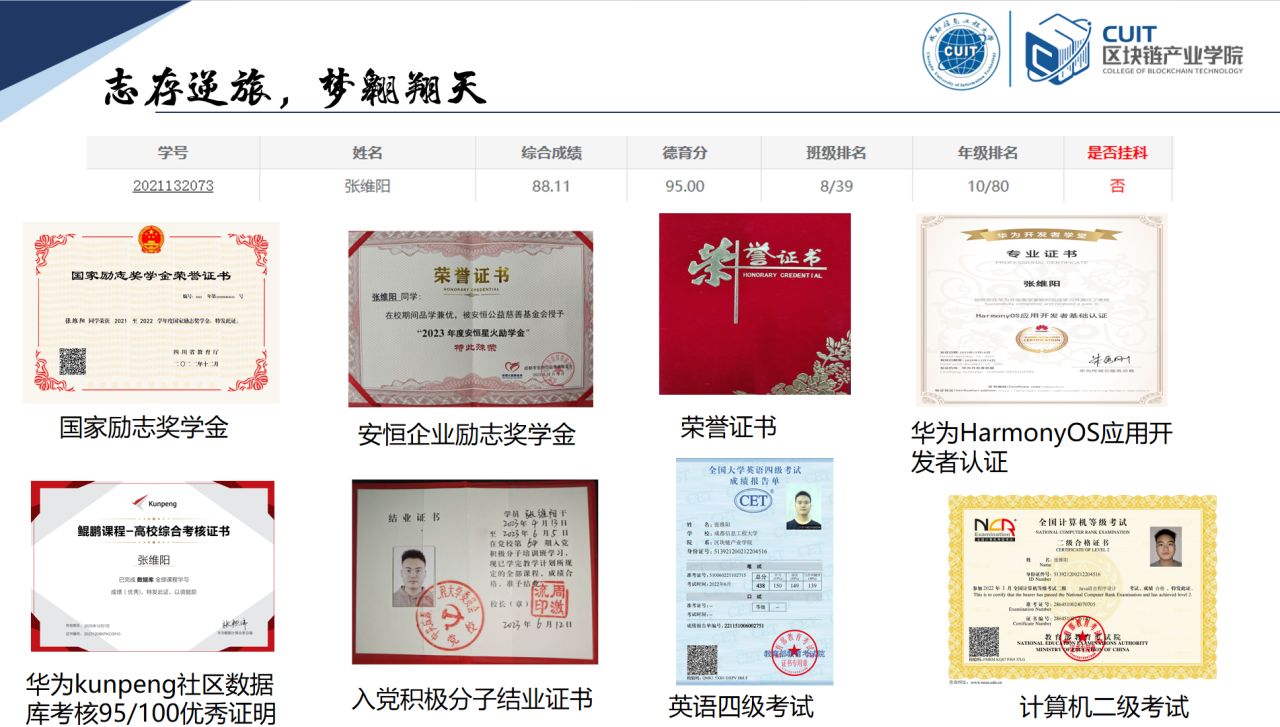 但并不甘心止步于此,持续不懈的努力他在2023年末跻身Web3.0创新大赛数字生成赛道,并在全国总决赛中获得优秀奖。接连获得“安恒·星火”励志奖学金后,又积极参与了华为HarmonyOS应用开发项目,不仅成功获得HarmonyOS应用开发者基础认证,还深入参与了华为kunpeng开源社区数据库相关项目,并且在综合考核中取得95/100,数据库计算业务表现为优秀。