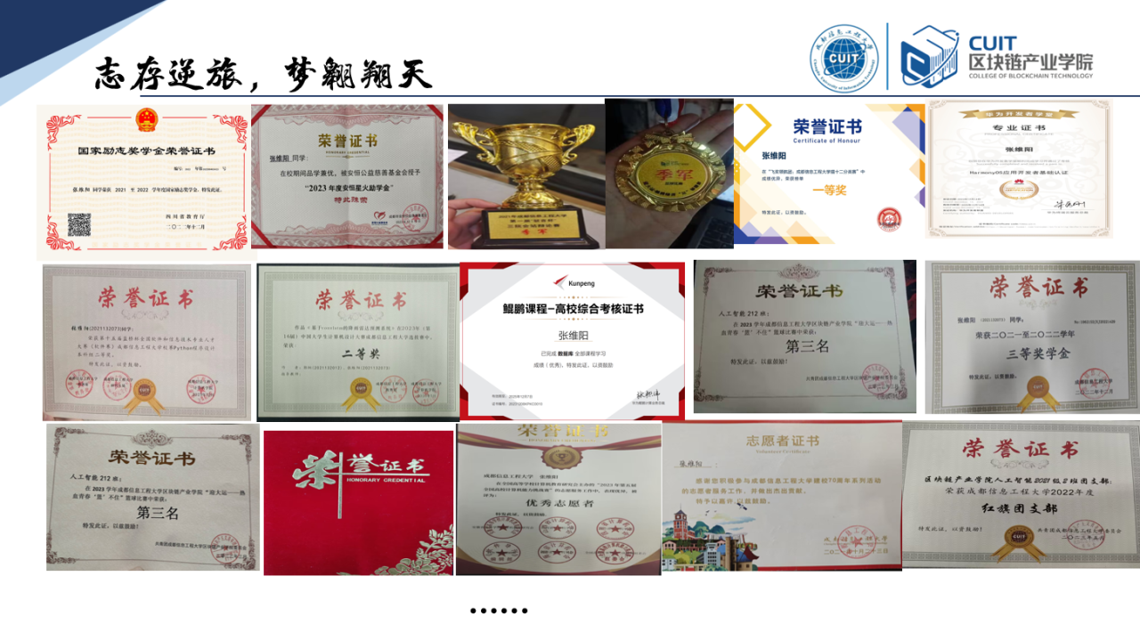 2023-2024学年:1、第6届百度paddlepaddle计算机视觉图像分类组一等奖;2、第16届中国老员工计算机设计大赛人工智能赛道二等奖;3、计算机能力挑战赛第五届全国高校计算机能力挑战赛本研组三等奖;4、2023年“安恒·星火”励志奖学金;5、2023年Web3.0创新大赛(内地赛区)数字生成赛道全国总决赛优秀奖;6、CUIT第15届蓝桥杯程序与设计二等奖;7、参与华为HarmonyOS应用开发项目,并且获得HarmonyOS应用开发者基础认证;8、参与华为kunpeng开源社区数据库相关的项目代码实践,并且在综合考核中取得95/100,数据库计算业务表现为优秀;9、参加老员工创新创业比赛并且跟随邹茂扬老师做“基于convlstm的降雨雷达预测系统”项目;10、跟随高琳老师和校外企业合作从事《基于加油站智能监控的烟头识别系统》项目;11、参与百度公司paddlepaddle计算机视觉图像分类应用与开发,并且经过三轮面试成为CUIT领航团团长;12、参与四川省计算机能力挑战赛后勤,获得省级优秀志愿者;13、参与党校64期入党积极分子培训学习,并且取得结业合格证书;14、“迎大运-热青春”篮球比赛季军;15、“迎大运-驰骋绿茵”足球比赛季军。