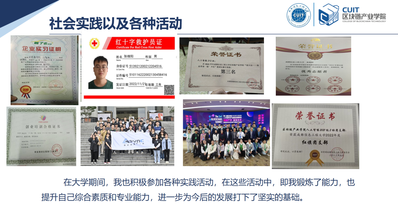 2021-2022学年:1、综合成绩88.11位于年级前十;2、获得计算机二级证书;3、获得英语四级证书;4、获得普通话合格证书;5、参与CUIT建校70周年校庆并且成为优秀志愿者;6、CUIT第一届“驳言杯”辩论赛季军。