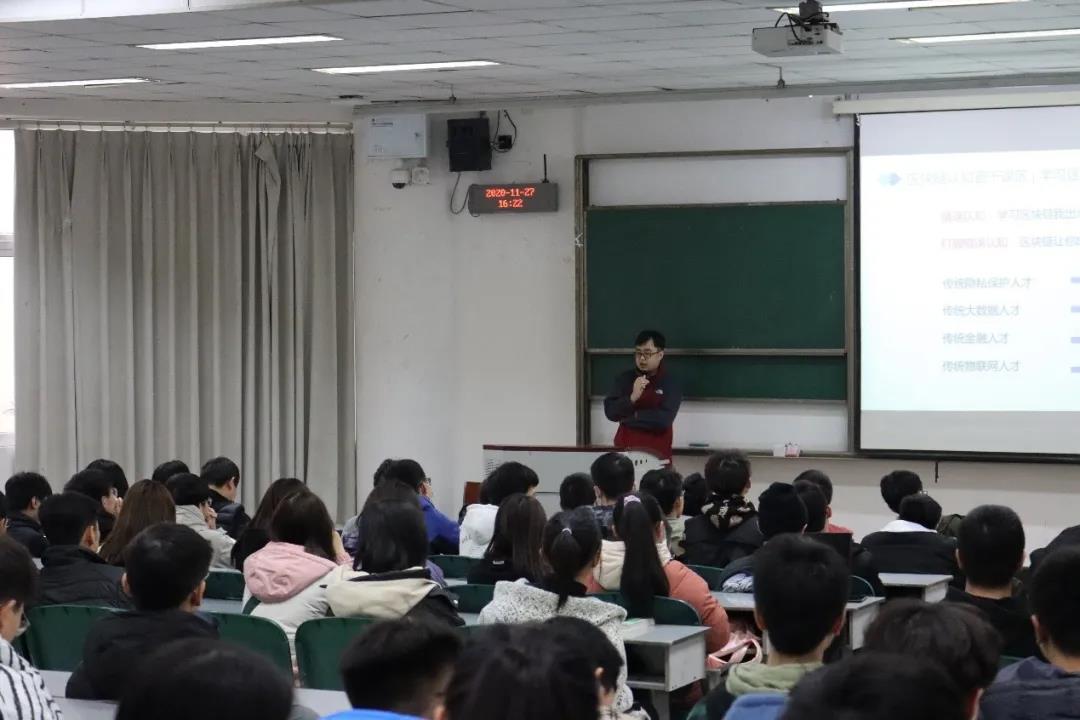 11月27日下午柏链教育科技CTO李骜华应学院邀请,为20级区块链工程专业全体师生作了题为“区块链打造超级计算机人才”的讲座。讲座由公司党总支副书记姜宇忠主持,在4213教室进行。