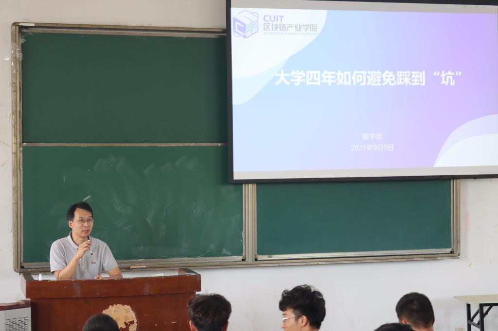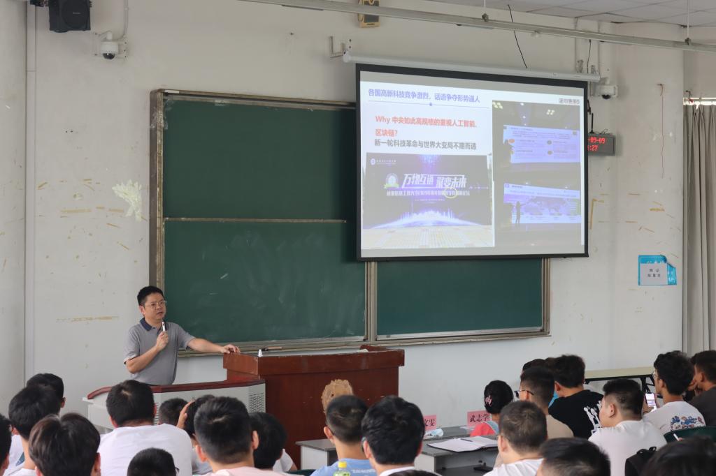 武志学为全体新生做“区块链工程”和“人工智能”专业介绍。他以“是什么”、“为什么学”、“学什么”及“就业如何”四个问题引入,通过案例分析、数据对比、政策解读等方式引导同学们全面了解两个专业。他指出,两个专业都属于国家发展战略范畴,是新基建的重要内容,希望同学们认识到所学专业的重要性,好好学习专业知识,加入新技术革命的浪潮中,为实现国家核心技术自主尽一份自己的力量。