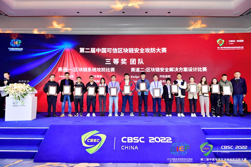 本次大赛自9月启动,来自北京、上海、广东、湖南、 广西壮族自治区等中国21个省份共计118支队伍报名,参赛团队涵盖了来自中山大学、北京邮电大学、东南大学、电子科技大学等重点高校,蚂蚁区块链科技(上海)有限公司、浪潮云信息技术股份公司、中国电子科技网络信息安全有限公司、中国联合网络通信集团有限公司等头部企业,以及网络通信与安全紫金山实验室、湖南省东方区块链安全技术检测中心等知名机构的团队。经过线上初赛,公司以区块链产业学院大三员工为主构建的团队Chain-Sec Labs,在与众多头部企业和名校的队伍比拼中,闯进决赛,决赛有15支队伍,经过两天的决赛,公司代表队Chain-Sec Labs在决赛中获得三等奖的好成绩。