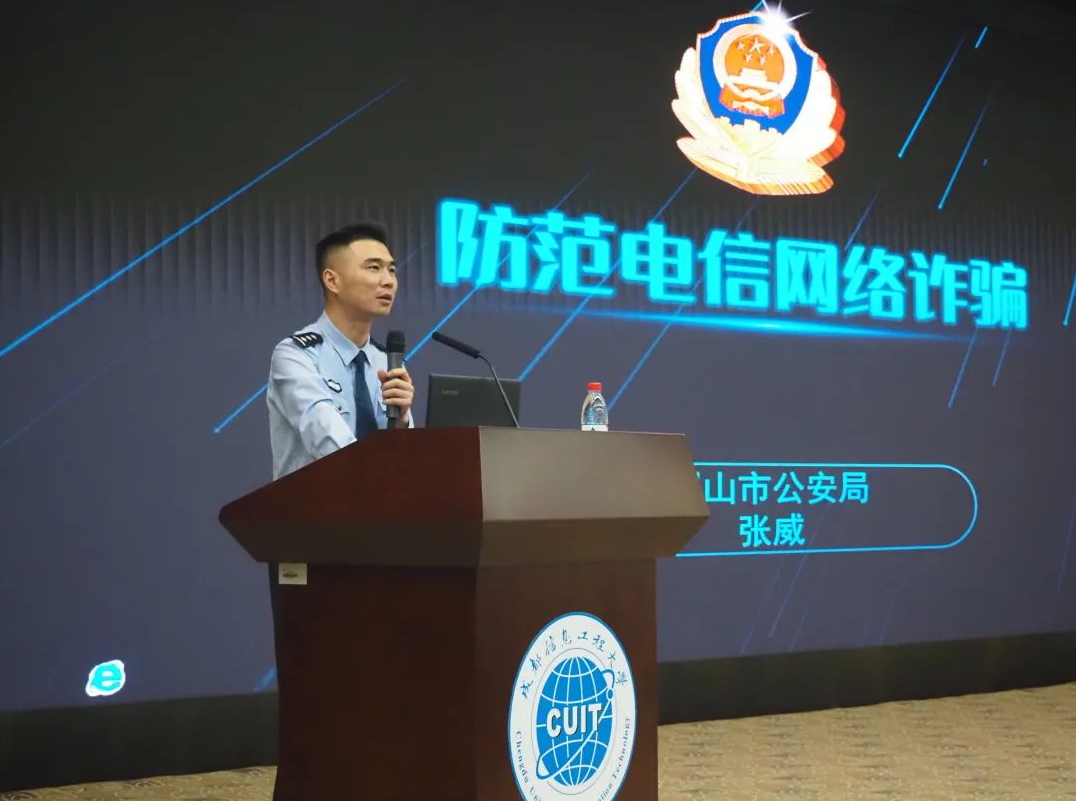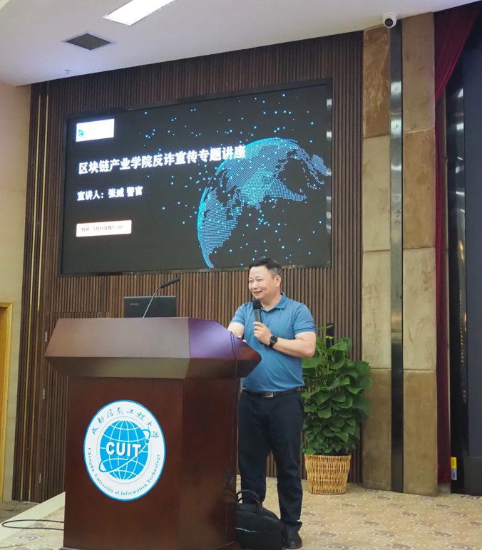 为加强高校同学防诈意识,提高防诈能力,5月31日晚7点,区块链产业学院邀请张威警官在国际会议厅举行防范电信网络诈骗讲座,公司党委书记林细俤、副书记姜宇忠、2022级辅导员罗霞以及学院2022级全体同学参加此次讲座。
