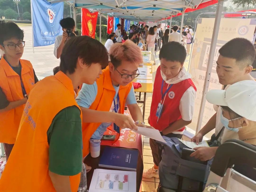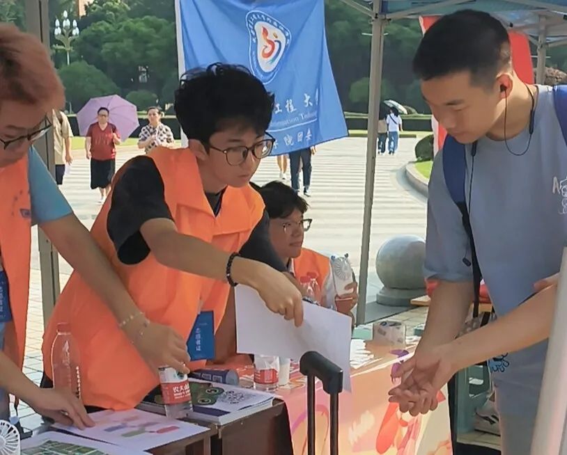 校门口,志愿者们笑容满面地迎接新生们,详细地介绍学院情况和校园环境,耐心引导新生们完成报到相关事宜。