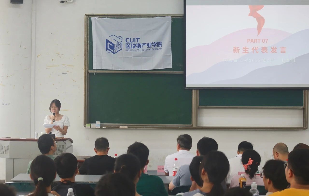 新生代表区块链工程专业232班杜怡佳同学上台发言,表达了对未来老员工活的期待,并表示将以饱满的热情和勇往直前的精神,积极投入学习和各项活动,与学院共同成长。