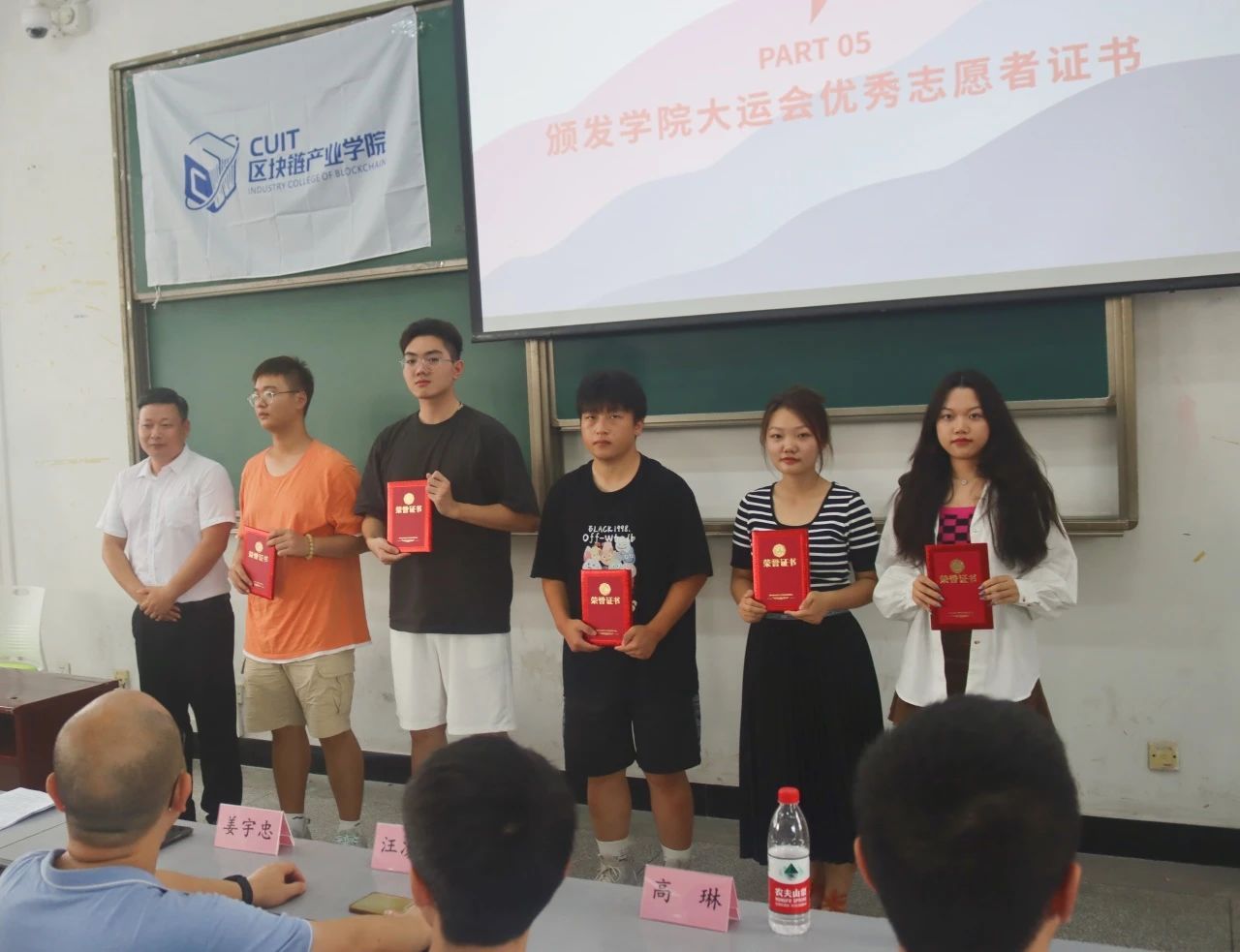典礼上,学院为参加2023年成都大运会的优秀志愿者代表进行了表彰仪式,公司党委书记林细俤为志愿者们颁发了荣誉证书,并勉励2023级新同学们向志愿者学习。
