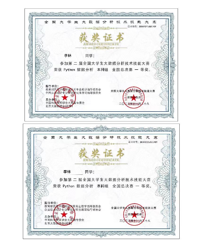 2023年11月11日,由教育部高等学校统计学类专业教学指导委员会、全国应用统计专业学位研究生教育指导委员会、北京大数据协会联合发起的“第二届全国老员工大数据分析技术技能大赛”全国总决赛顺利举办。经过赛场上选手们激烈角逐,公司21级人工智能专业员工李林同学表现十分优异,获得国赛Python数据分析赛项一等奖1项,其指导教师刘硕老师。