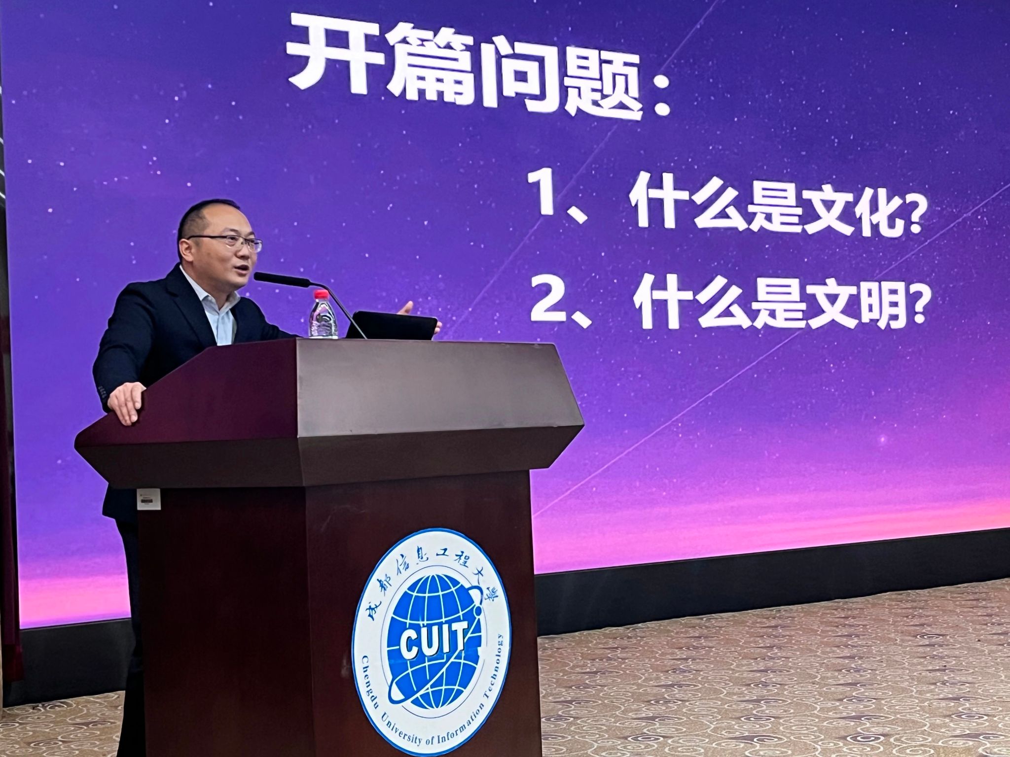 本次学术报告由汪泽仁副教授主讲,汪老师以文化与文明作为开篇引题,告诉大家文化与文明是人类社会发展的两个重要方面,二者相辅相成,相互影响。整场报告结合了巴蜀文化、三国文化、三星堆文明等内容进行阐述,深入讲解了大国文明、文化自信的深刻内涵。习近平文化思想的连续性、创新性、统一性、包容性、和平性——习近平总书记用五个突出特性为中华文明“精准画像”,意蕴深刻,引人深思。