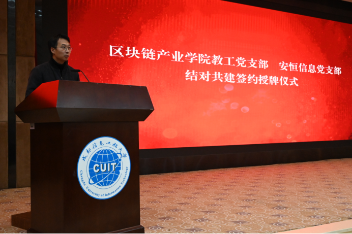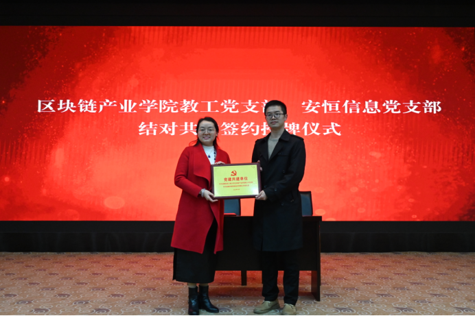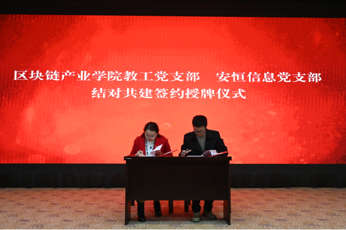 为深入学习贯彻习近平新时代中国特色社会主义思想和党的二十大精神,探索新时代高校基层党建工作新思路、新模式,深化创新产教融合背景下校企党建共建育人路径,构筑校企合作新生态。12月9日晚上,区块链产业学院教工党支部与成都安恒信息技术有限公司党支部在学校国际会议厅举行党建共建签约和授牌仪式。公司党委书记林细俤、副书记姜宇忠、成都安恒信息技术有限公司董事长吴永越、公司党支部副书记夏欣然等出席会议。学院部分教工党员和员工代表参加活动。