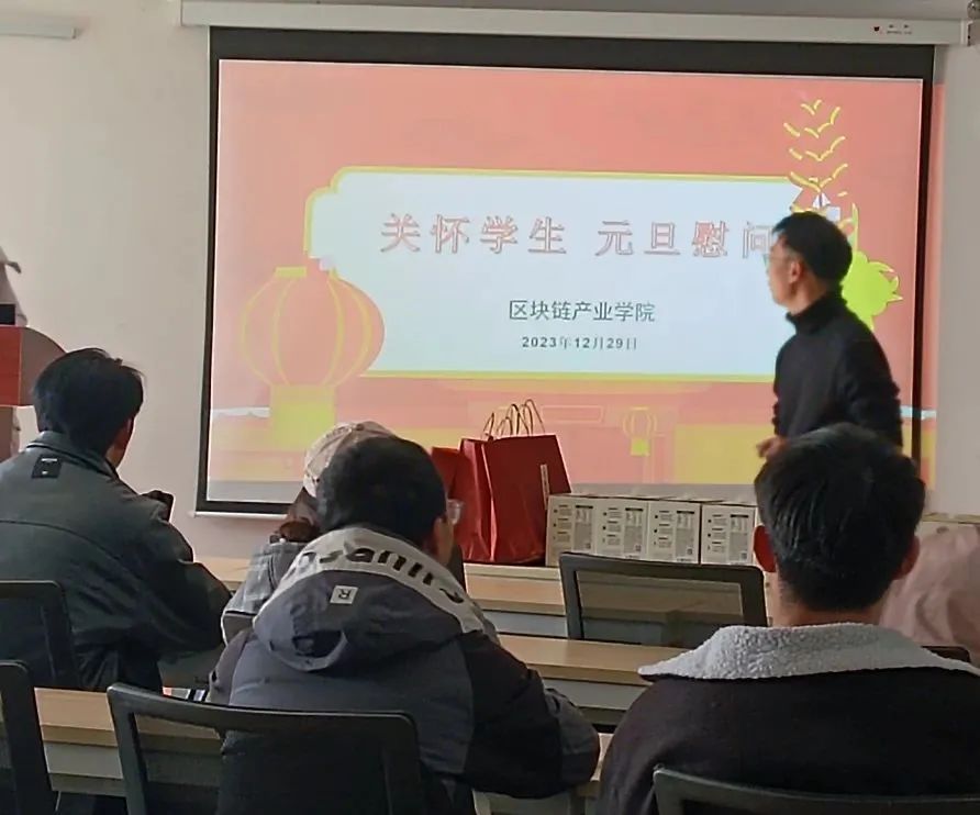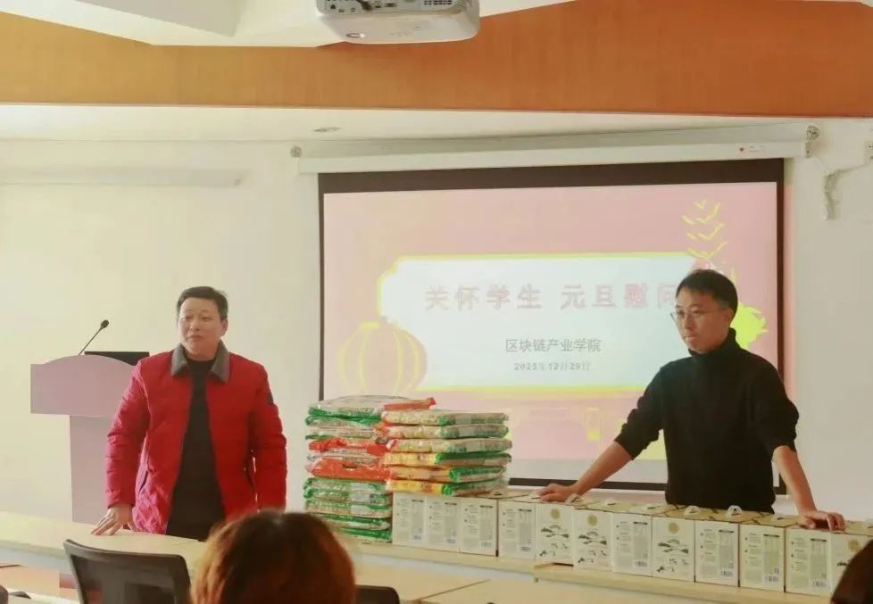 林细俤和姜宇忠共同向同学们发放了精心准备的元旦慰问礼品。