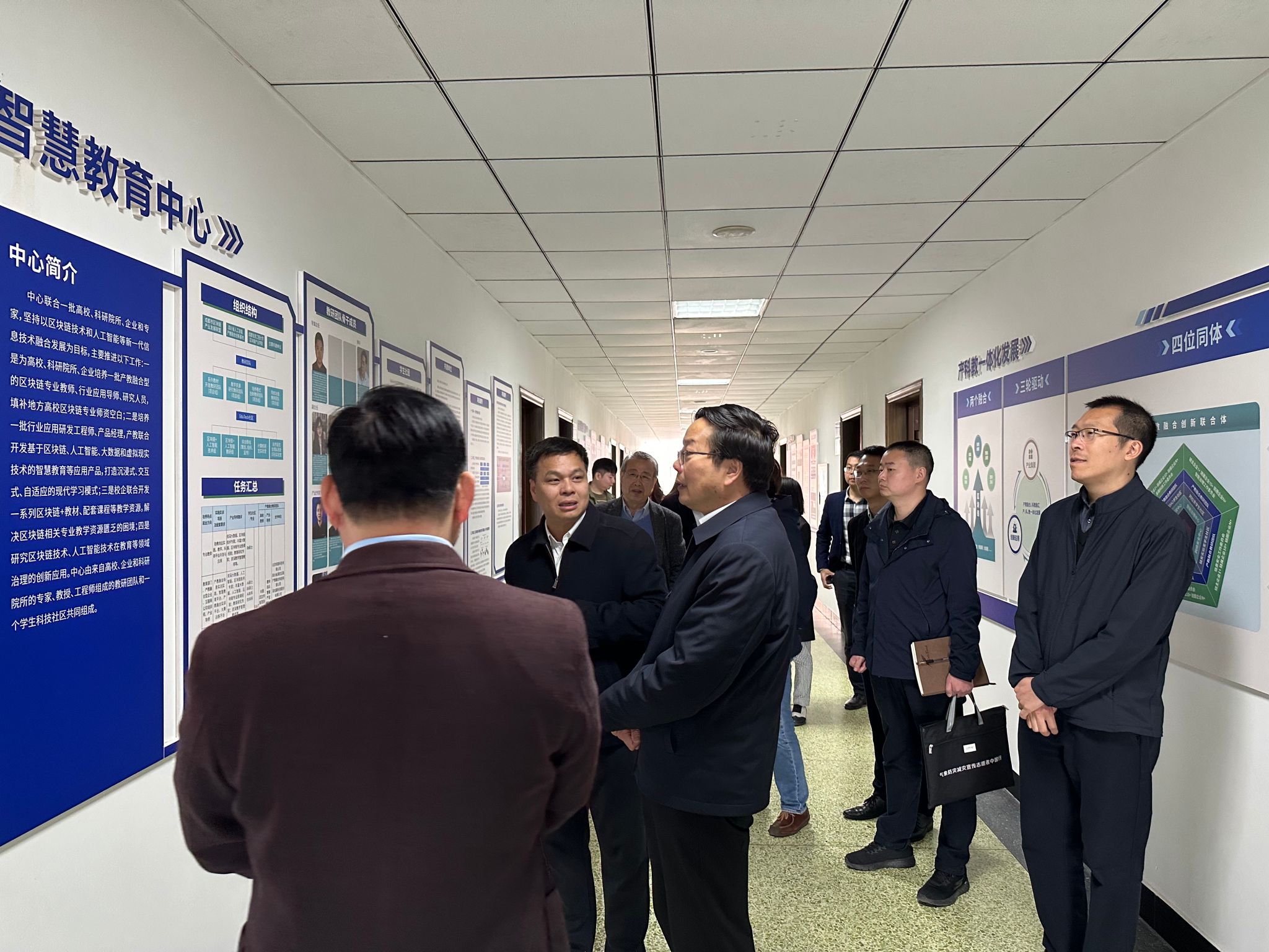 沈火明一行首先参观了区块链产业学院文化墙,了解学院发展历程和产教融合特色。调研会上,李飞全面介绍了学院的基本情况,并就学院近年来的教学、科研、等业务工作情况及特色亮点工作等方面进行了汇报;林细俤就公司党建和思政工作进行了汇报;杨明顺代表学院共建方介绍了学院共建背景,并对学院发展提出了意见和建议。