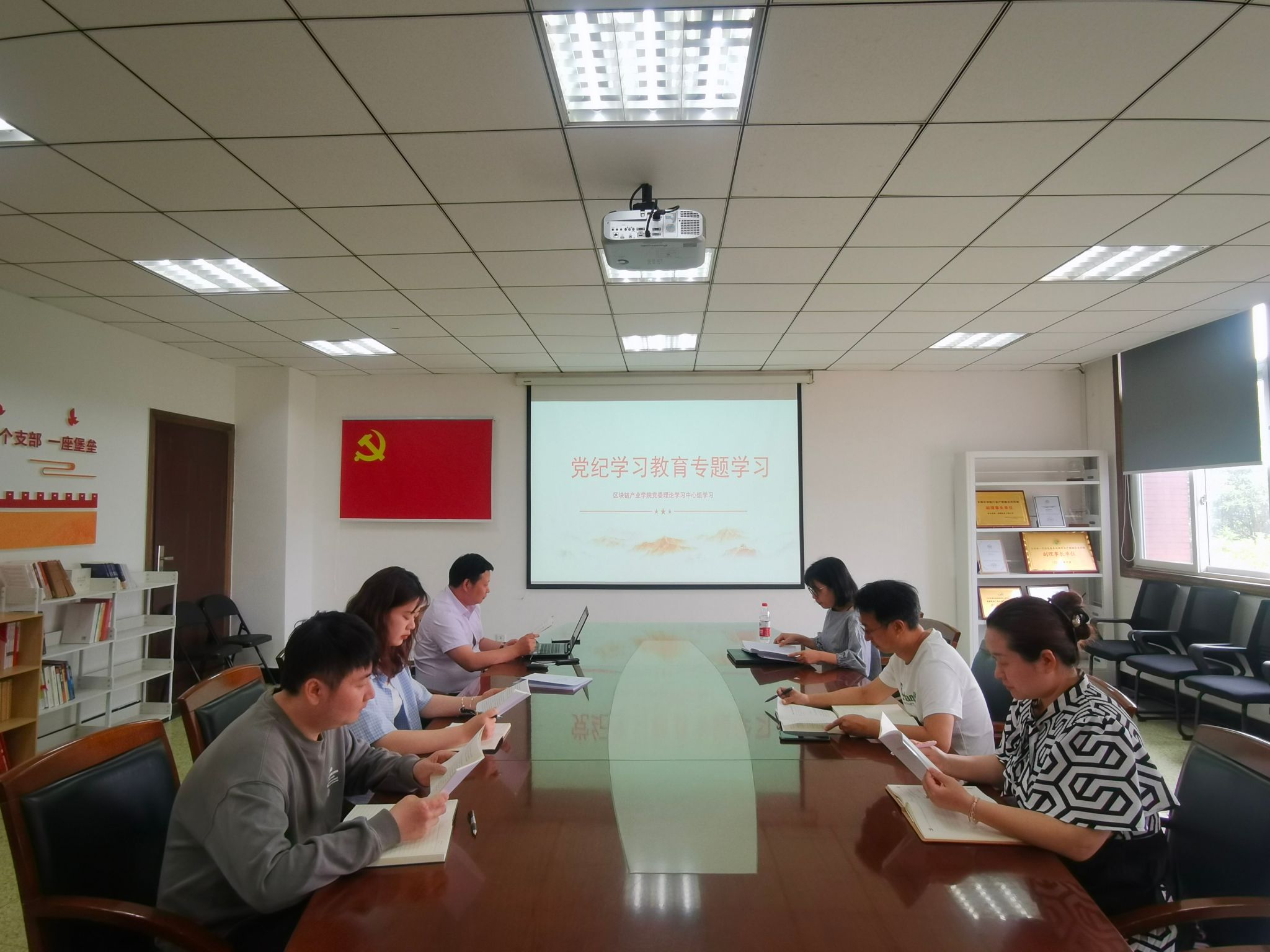 4月26日下午,区块链产业公司党委理论学习中心组在信息楼三会议室开展党纪学习教育专题学习。会议由公司党委书记林细俤主持,公司党委委员及各支部书记参加了本次学习。