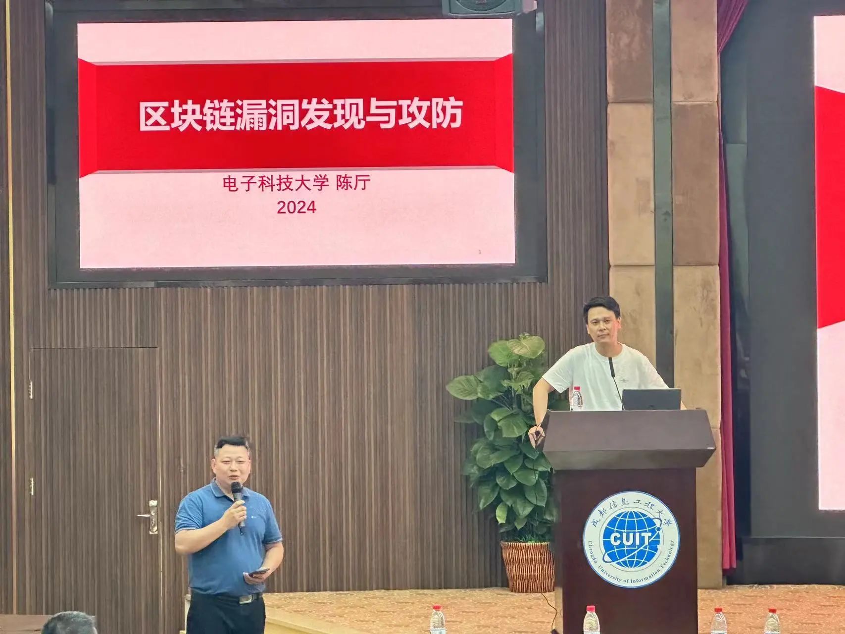 6月3日晚,青年长江学者、电子科技大学计算机学院教授、博士生导师陈厅应邀在公司航空港校区国际会议厅带来题为《区块链漏洞发现与攻防》的精彩学术报告,区块链产业学院部分教师、全体研究生及2022、2023级本科生共200多人聆听此次报告。报告由公司党委书记林细俤主持。