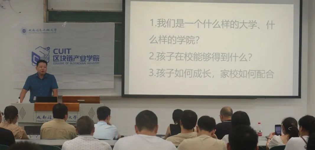 公司区块链工程专业系主任汪凌锋向新生家长们详细介绍了区块链工程专业的设立背景和前景,强调其在信息技术领域的创新应用,并以实例阐述了区块链技术在金融、供应链管理、智能合约等领域的广泛应用。