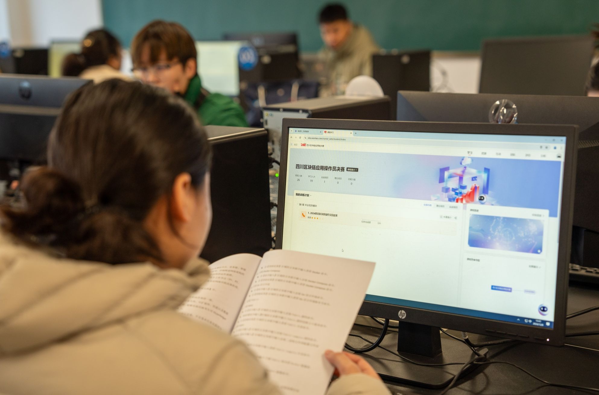 区块链应用操作员赛项的初赛于11月25日在学校航空港校区举行,选手们在竞赛平台上进行了激烈的比拼,最终32名选手脱颖而出进入决赛。12月8日,决赛在伟德国际victor1946芯谷校区举行,32名选手个个精神饱满,在比赛中严谨思考,认真比拼,充分展现了在区块链知识领域和实际操作方面的优秀技能。