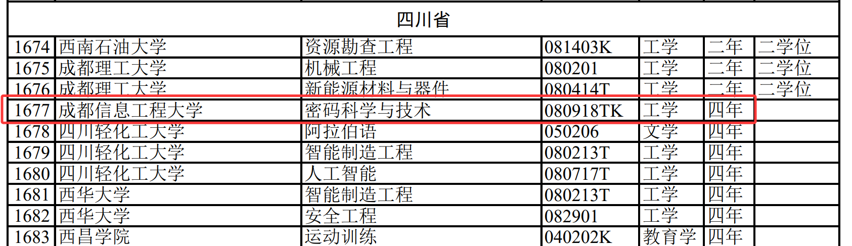 4月22日,教育部网站发布《关于公布2024年度普通高等学校本科专业备案和审批结果及<普通高等学校本科专业目录(2025年)>的通知》,公司申报的密码科学与技术(080918TK,工学)本科专业获批,是四川省首个设立密码科学与技术本科专业的高校。4月22日,教育部网站发布《关于公布2024年度普通高等学校本科专业备案和审批结果及<普通高等学校本科专业目录(2025年)>的通知》,公司申报的密码科学与技术(080918TK,工学)本科专业获批,是四川省首个设立密码科学与技术本科专业的高校。