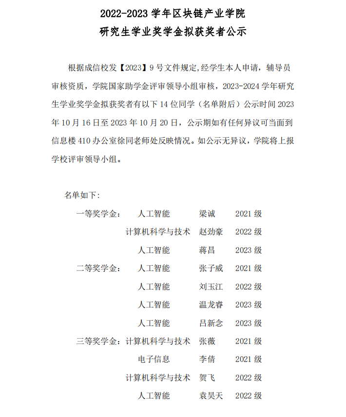 2022-2023 学年区块链产业学院 研究生学业奖学金拟获奖者公示