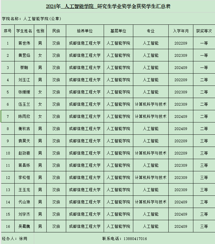 根据成信校发【2024】9号文件规定,经员工本人申请,辅导员审核资质,学院员工国家奖/助工作评审领导小组审核,确定蒋世伟等16位同学为2024年研究学业奖学金拟获奖者,公示时间2024年10月14日至2023年10月18日,公示期如有任何异议可当面到信息楼410办公室徐同老师处反映情况。如公示无异议,学院将上报学校评审领导小组。