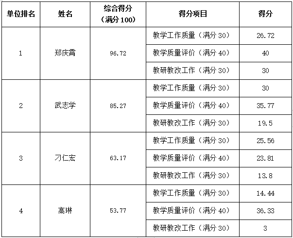 根据汇总分数从高到低排序,经党政联席会通过,拟将符合条件的老师分数计算如下,并按照分数高低进行排名,现予公示。