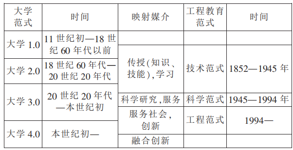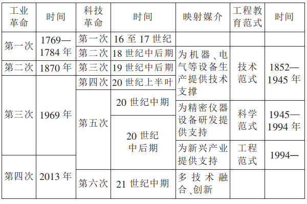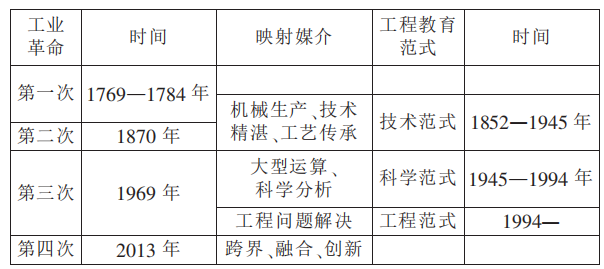 2. 工业革命与工程教育范式的映射关系。工程教育的目的是为工业培养人才,也就是说工程教育要满足和服务于工业的需求。与工业革命相似,工程教育范式转换也有“革命性”的一面,这二者之间存在如表2所示的映射关系。