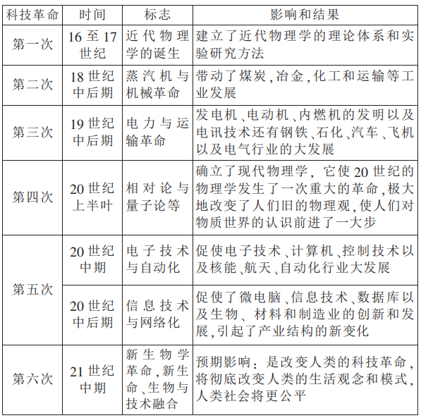 1. 历次科技革命及其作用和意义。世界所经历的科技革命,有比较明显标志的有6次。每一次科技革命对人类文明和社会进步起到了非常重要的作用。(见表3)