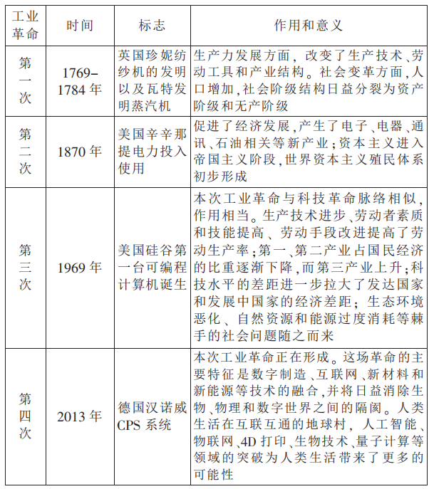 1. 历次工业革命及其作用和意义。世界所经历的工业革命,有比较明显标志的有4次。每一次工业革命,既是一次生产力的巨大变革,又是一场深刻的社会变革,对人类文明和社会进步起到了非常重要的作用。(见表1)