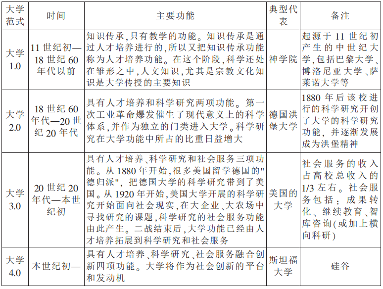 1. 历次大学范式转换及其作用和意义。世界所经历的大学范式转换,有比较明显标志的有4次。大学功能从以前的知识传承、人才培养,到现在的人才培养、科学研究、社会服务、文化传承,无疑都是非常大的进步和发展,这对人类文明和社会进步起到了非常重要的作用。(见表5)