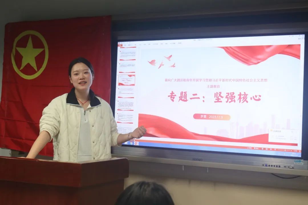同时,罗霞老师带领大家学习了⟪面向广大团员和青年开展学习贯彻习近平新时代中国特色社会主义思想主题教育团支部专题学习⟫中专题二“坚强核心”的内容。