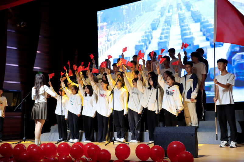旋律激昂澎湃,声音洪亮有力,人工智能242班汇成一股汹涌的热浪,瞬间点燃了全场的激情。坚定、豪情、无畏,彰显着身为中华儿女的自豪与骄傲。