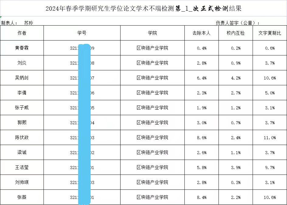 区块链产业学院2024年春季学期研究生学位论文学术不端检测第_1_次正式检测结果公示